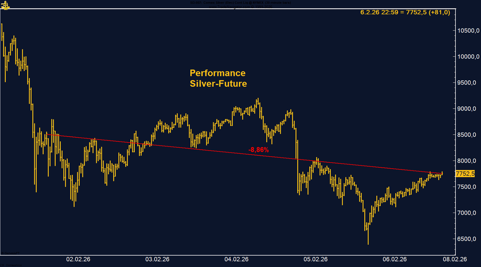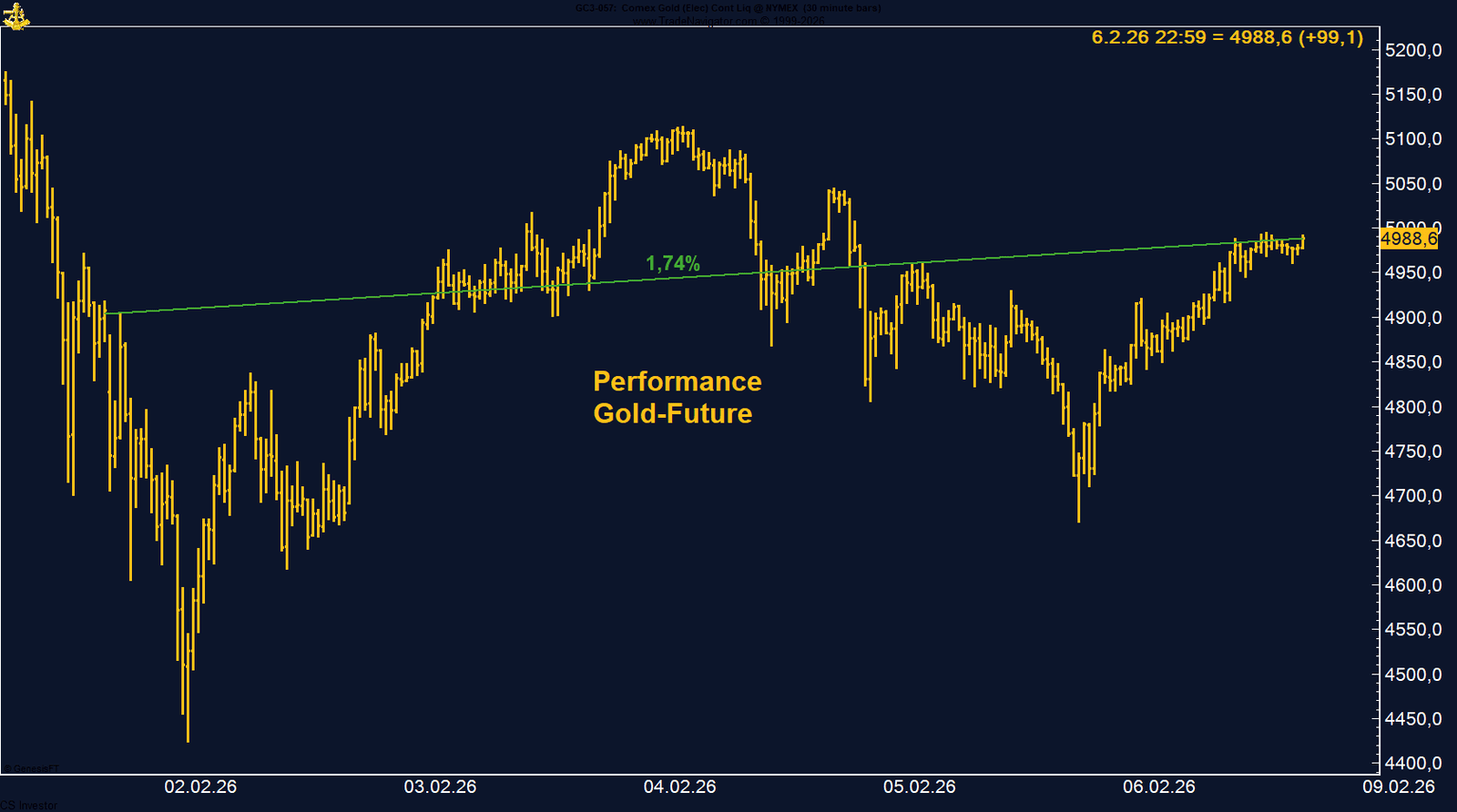 Der Gold-Future erlebte eine erneut sehr schwankungsreiche Handelswoche. Zu Wochenbeginn kam es zu einem deutlichen Abverkauf, der den Future zunächst bis auf ein Tief bei 4.423,2 führte. Im weiteren Verlauf setzte jedoch eine kräftige Gegenbewegung ein und Gold beendete die Woche bei 4.988,6 Punkten mit einem Plus von 1,74 %. Die Bewegung unterstreicht, dass der vorherige Druck weniger fundamental als vielmehr liquiditäts- und positionsgetrieben war.
